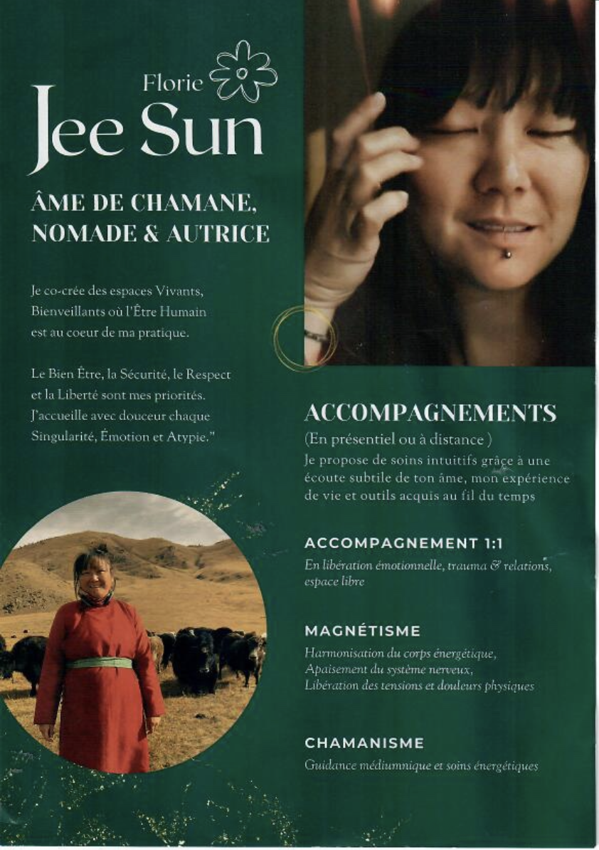 Âme de chamane, Jee Sun pratique des soins intuitifs grâce à une écoute subtile de ton âme, de son expérience de vie et de ses outils acquis au fil du temps. Elle est autrice et nomade, accompagnatrice de voyage en Mongolie.
